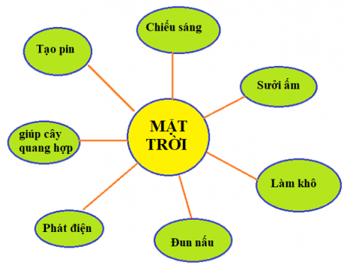 Mặt trời chiếu sáng và sưởi ấm muôn loài, giúp cho cây cối quang hợp để phát triển và xanh tốt, người và động vật khoẻ mạnh.