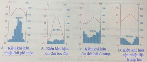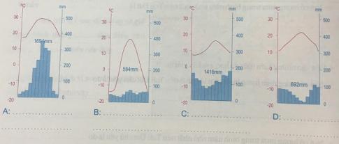 Căn cứ vào các biểu đồ nhiệt độ và lượng mưa A, B, C, D dưới đây, em hãy xác định chúng tiêu biểu cho kiểu khí hậu nào?