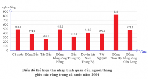- Các vùng có thu nhập bình quân đầu người cao hơn cả mức trung bình cả nước là: Đông Nam Bộ (833) và đồng bằng sông Hồng (488,2).