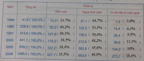 - Vẽ biểu đồ miền thể hiện sự chuyển dịch cơ cấu GDP phân theo thành phần kinh tế của nước ta trong giai đoạn 1990 – 2008 (trước khi vẽ, hãy xử lí số liệu về cơ cấu và điền vào bảng trên).