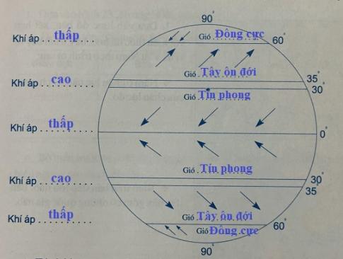 - Điền vào chỗ chấm (…) ở hình bên tên các đai khí áp và gió thổi thường xuyên trên Trái Đất.