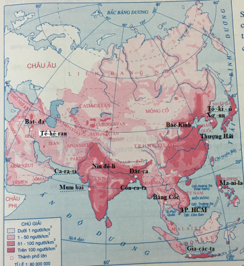 Giải TBĐ địa 8 bài 6: Thực hành đọc phân tích lược đồ phân bố dân cư và các thành phố lớn của Châu Á