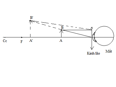 + Khi mắt lão không đeo kính, điểm cực cận Cc ở quá xa mắt. Mắt không nhìn rõ vật AB vì khoảng cách từ AB tới mắt nhỏ hơn khoảng cực cận của mắt
