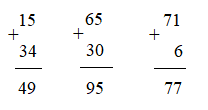 Đặt tính và tính: 15 + 34; 65 + 30; 71 + 6