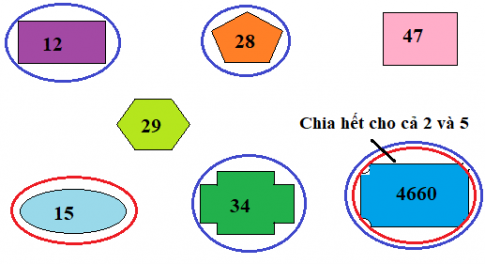 Những ô khoanh tròn màu XANH là chia hết cho 2, những ô khoanh tròn màu ĐỎ là chia hết cho 5