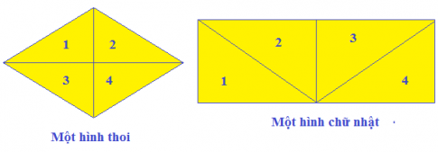b. Diện tích của hình chữ nhật vừa ghép bằng diện tích hình thoi vừa ghép (vì đều được tạo thành từ 4 hình tam giác có kích thước như nhau)