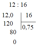 Trong phép chia trên có số bị chia là 12 bé hơn số chia 16, ta có thể chuyển 12 thành 12,0. Đặt tính rồi tính như phép chia 12,0 : 16.