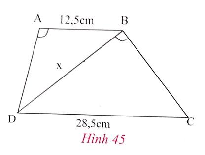 Tính độ dài x của đoạn thẳng BD trong hình 45 (làm tròn đến chữ số thập phân thứ nhất), biết rằng ABCD là hình thang (AB // CD); AB = 12,5cm, CD = 28,5cm;