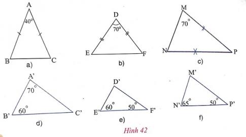 c) Trong các tam giác dưới đây (h.42), những cặp tam giác nào đồng dạng với nhau? Hãy giải thích.