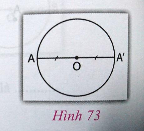 - Cho đường tròn tâm O, A là điểm bất kì thuộc đường tròn. Vẽ A' đối xứng với A qua O (h.73). Chứng minh rằng điểm A' cũng thuộc đường tròn tâm O.