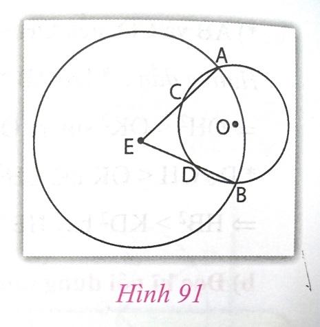 Cho đường tròn (O) và một điểm E nằm ngoài đường tròn, vẽ đường tròn (E) cắt đường tròn (O) tại hai điểm A và B (h.91). Các đoạn thẳng EA và EB lần lượt cắt đường tròn (O) tại C và D (cho như hình vẽ). Chứng minh rằng hai dây AC và BD của đường tròn (O) bằng nhau.
