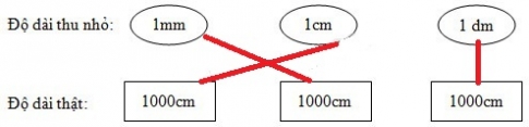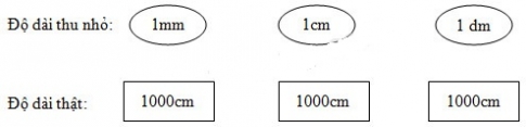 Nối tương ứng giữa độ dài "thu nhỏ" trên bản đồ tỉ lệ 1 : 1000 với “độ dài thật”: