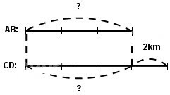 Đoạn đường AB ngắn hơn đoạn đường CD là 2km. Tìm chiều dài mỗi đoạn đường đó, biết ràng chiều dài của đoạn thẳng AB bằng