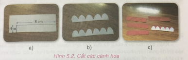 - Cắt cánh hoa mẫu: Kẻ, cắt một mảnh bìa hình chữ nhật có kích thước 1,5cm – 8cm. Vẽ và cắt hình các cánh hoa như hình 5.2b (nếu là hoa đào phai, đào rừng thì vẽ và cắt 5 cánh hoa). Nếu là mai thì vẽ và cắt 6 cánh hoa).