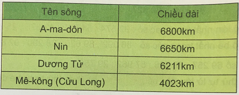 Bảng dưới đây cho biết chiều dài một số con sông lớn trên thế giới, hãy chỉ ra con sông nào dài nhất, con sông nào ngắn nhất. Viết tên các con sông theo thứ tự tăng dần về chiều dài.