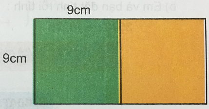 Hai tấm bìa hình vuông như nhau, cạnh bằng 9cm. Ghép hai tấm bìa này thành một hình chữ nhật (xem hình vẽ). Tính diện tích của hình chữ nhật đó bằng hai cách khác nhau?