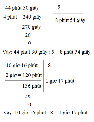 2. Đọc kĩ, thảo luận cách thực hiện phép chia số đo thời gian và nghe thầy/ cô giáo hướng dẫn (sgk)