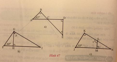 a) Cho biết các số đo x, y, t trong mỗi hình a), b), c) trên hình 47.