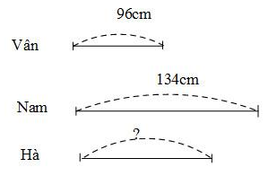 Vân cao 96cm, Nam cao 134cm. Chiều cao của Hà là trung bình cộng số đo chiều cao của Vân và Nam. Hỏi Hà cao bao nhiêu xăng-ti-mét?