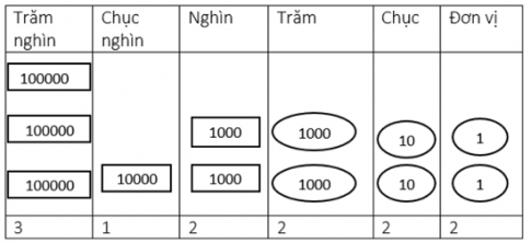 | Viết số | Trăm nghìn | Chục nghìn | Nghìn | Trăm | Chục | Đơn vị | Đọc số |