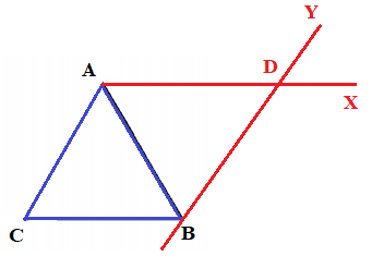 Bài 4: a. Vẽ đường thẳng AX đi qua điểm A và song song với cạnh BC. Vẽ đường thẳng CY đi qua diểm C và song song với cạnh AB. Các đường thẳng này cắt nhau tại điểm D( vẽ vào hình bên).