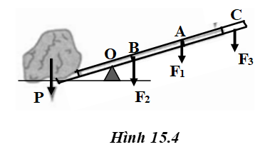 15.b. Dùng xà beng để bẩy vật nặng lên (H.15.4). Phải đặt lực tác dụng F của người ở đâu để bẩy vật lên dễ nhất?