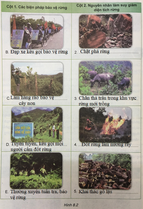 a. Ở bảng dưới đây, các hình ảnh trong cột 1 là các biện pháp bảo vệ rừng; hình ảnh trong cột 2 là các nguyên nhân làm suy giảm diện tích rừng. Hãy đặt tên thích hợp cho các hình trong bảng dưới đây bằng cách điền vào chỗ trống dưới mỗi hình ảnh.