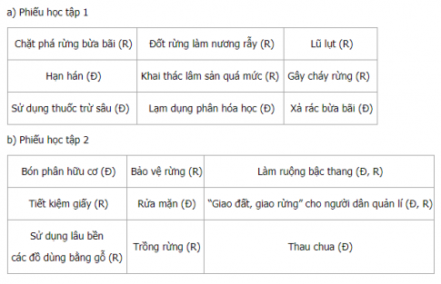Hoàn thành phiếu học tập: Viết chữ Đ vào bên cạnh các cụm từ chỉ nguyên nhân gây suy thoái đất. Viết chữ R vào bên cạnh các cụm từ chỉ nguyên nhân gây suy giảm rừng.