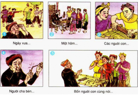 - Tranh 5 : Người cha khuyên các con phải biết đoàn kết lại với nhau, như vậy mới vững mạnh. Cả bốn người con cùng hiểu ra câu nói của cha : Thưa cha, chúng con sẽ vâng lời cha dặn !