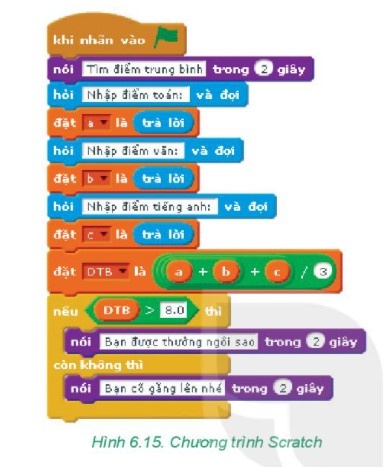 - HS 2 có điểm Toán được 7, điểm Văn là 6 và điểm Tiếng Anh là 8. Khi đó đữ liệu đầu vào là a = 7, b = 6, c = 8, chương trình tính ĐTB = (7 + 6 + 8)/3 = 7, vì ĐTB < 8 nên đấu ra chương trình thông báo “Bạn cố gắng lên nhé”