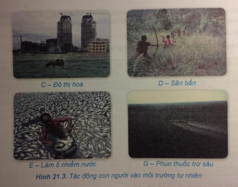 Quan sát các hình sau và nêu ảnh hưởng của con người tác động đến môi trường sống của các loài sinh vật, từ đó trình bày quan điểm của em về mỗi hoạt động.