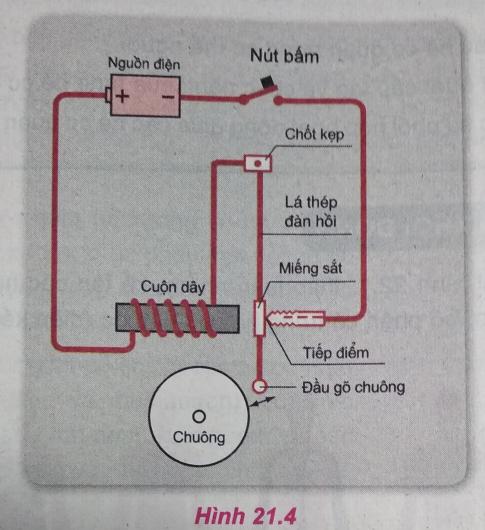 Hình 21.4 là sơ đồ mạch điện của một chuông điện loại khác, khi bấm và giữ nút bấm, chuông kêu, tắt; kêu, tắt liên tục (cho đến khi thôi bấm). Hãy giải thích tại sao.