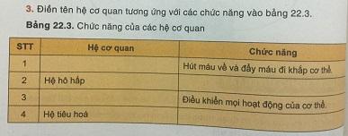 3. Điền tên hệ cơ quan tương ứng với các chức năng vào bảng 22.3.