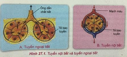 Quan sát hình 27.1, so sánh tuyến nội tiết với tuyến ngoại tiết.