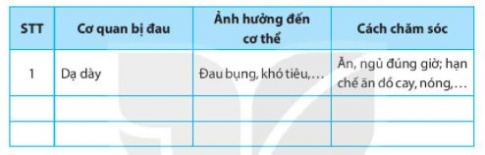 Câu 23.4. Hãy tìm hiểu về sự ảnh hưởng khi một số cơ quan trong cơ thể (như: dạ dày, tim, phổi,...) bị tổn thương tới cơ thể chúng ta và đưa ra cách chăm sóc để các cơ quan đó khoẻ mạnh theo bảng gợi ý dưới đây.
