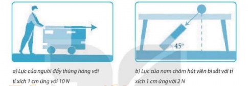 b) Lực nam châm hút viên bị sắt có phương nghiêng với phương nằm ngang (hoặc phương thẳng đứng) một góc 45°, chiều hướng từ trên xuống, cường độ 2 N.