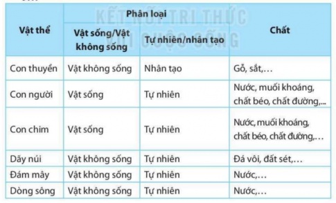 Liệt kê một số vật thế có trong Hình 9, phân loại vật thể đó và kể tên một số chất có trong vật thể đo theo bằng mẫu sau đây: