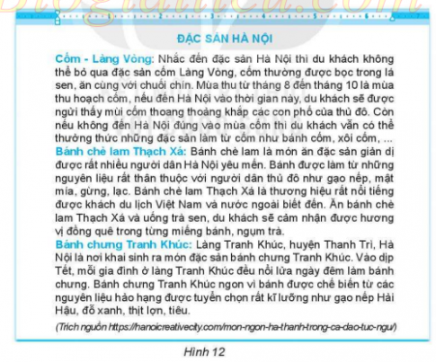 An đã soạn thảo xong phần văn bản “Đặc sản Hà Nội" như Hình 12. Theo em, An đã sử dụng những lệnh căn lề đoạn văn bản nào?