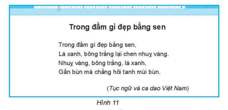 Câu 11.9. Bạn Minh đã soạn thảo một câu ca dao và định dạng văn bản như Hình 11. Theo em, bạn Minh đã sử dụng những lệnh nào để căn chỉnh lề của các đoạn văn bản? Giải thích?