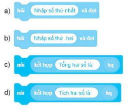 Câu 15.5. Cho các câu lệnh Scratch sau đây, câu lệnh nào thực hiện nhập dữ liệu đầu vào, câu lệnh nào thực hiện thông báo kết quả đầu ra của thuật toán?
