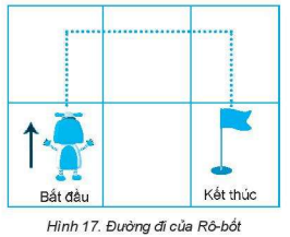Câu 15.13. Trong Hình 17, Rô-bốt cần tìm đường đí từ vị trí bắt đầu đến vị trí kết thúc. Biết Rô-bốt chỉ thực hiện được các hành động quay trái, quay phải và tiến 1 bước, lùi 1 bước. Ban đầu Rô-bốt đứng ờ ô bắt đầu và quay mặt theo hướng mũi tên trong Hình 17. Dưới đây là một cách đi của Rô-bốt từ ô bắt đầu đến ô kết thúc: