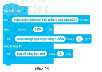 Câu 17.15. Bạn Khoa muốn viết chương trình Scratch để thực hiện cuộc thi tìm hiểu lịch sử Việt Nam. Hình 26 là một chương trình Scratch mà bạn đã viết.