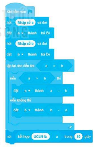 d) Chương trình Scratch thực hiện thuật toán tìm ước số chung lớn nhất (hình 42)