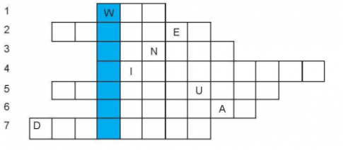 Câu 6.17. GIẢI ô CHỮ. Hãy tìm từ khoá trong cột màu xanh của ô chữ dưới đây. Biết rằng mỗi từ hoặc cụm từ trong mỗi hàng là đáp án cho mỗi câu hỏi tương ứng sau: