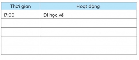 Câu 9. Viết thời gian biểu của em từ 5 giờ chiều (17:00) đến lúc đi ngủ.