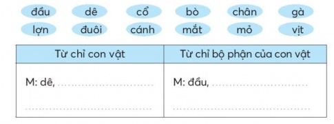 | M: dê, bò, gà, lợn, vịt | M: đầu, cổ, chân, đuôi, cánh, mắt, mỏ |