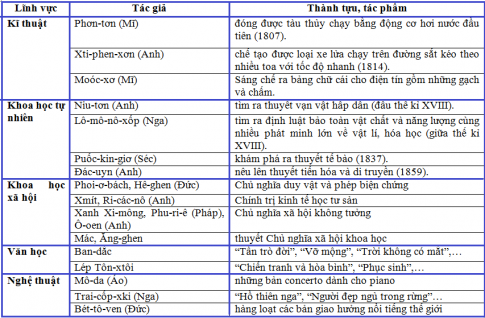 Lập bảng thống kê những thành tựu chủ yếu của kĩ thuật, khoa học, văn học, nghệ thuật trong các thế kỉ XVIII - XIX