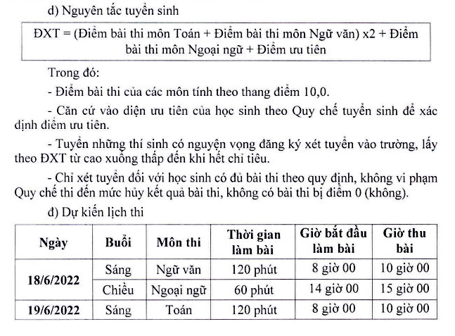 Điểm xét tuyển là tổng điểm 03 môn thi và điểm cộng thêm dành cho đối tượng ưu tiên. Nội dung sẽ nằm trong chương trình trung học cơ sở do Bộ Giáo dục và Đào tạo ban hành, chủ yếu ở lớp 9.