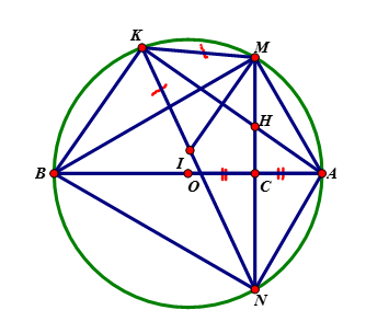 Cho đường tròn tâm O đường kính AB = 2R. Gọi C là trung điểm của OA; qua C kẻ đường thẳng vuông góc với OA cắt đường tròn đó tại hai điểm phân biệt M và N. Trên cung nhỏ BM lấy điểm K ( K khác B và M), trên tia KN lấy điểm I sao cho KI = KM. Gọi H là giao điểm của AK và MN. Chứng minh rằng: