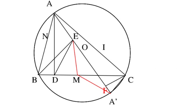 Cho tam giác ABC có 3 góc nhọn và AB < AC nội tiếp trong đường tròn tâm O. Kẻ đường cao AD và đường kính AA' .Gọi E, F theo thứ tự là chân đường vuông góc kẻ từ B, C xuống AA' .